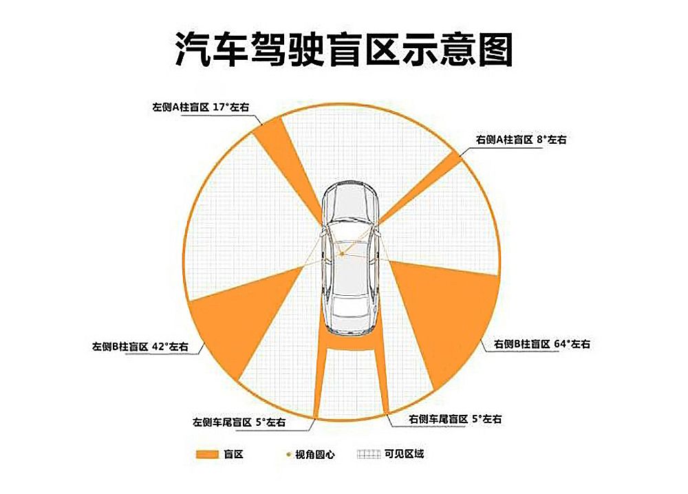 前区左右A柱盲区,左右B柱包括后方左右C柱等车主无法准确判别驾乘是否安全。