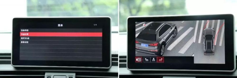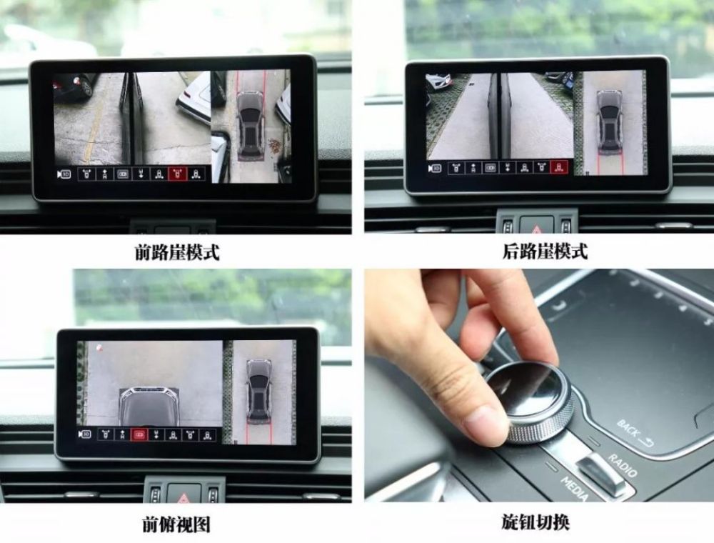 在打开360°全景界面后,右边画面显示车辆俯视图,直观清晰的看出车辆四周的情况。左边画面可以通过MMI触控板上的旋钮切换多达10种不同的画面,每个画面成像清晰,细节保留真实,可用度非常高。其中路崖模式适合非常狭窄的道路使用,不用再把头伸出窗外左看右看了。