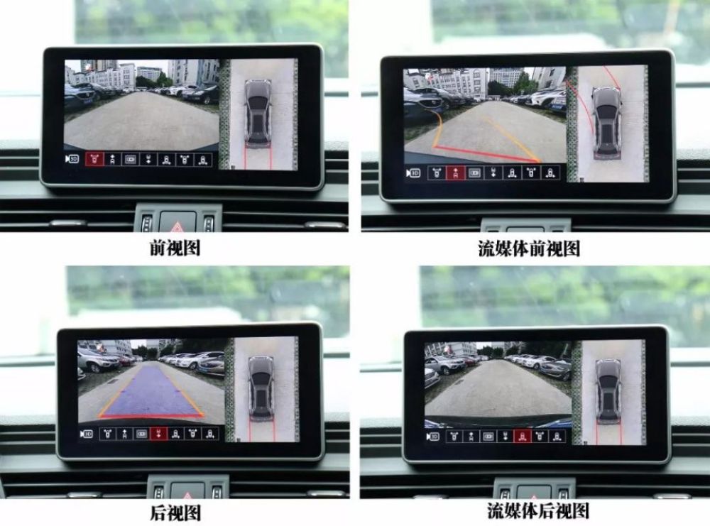 而前视图与流媒体前视图的区别在于前者角度更大,适合观看车辆前方的盲区,后者随方向盘的转动轨迹提供给驾驶者更加便捷、精准的停车视角。