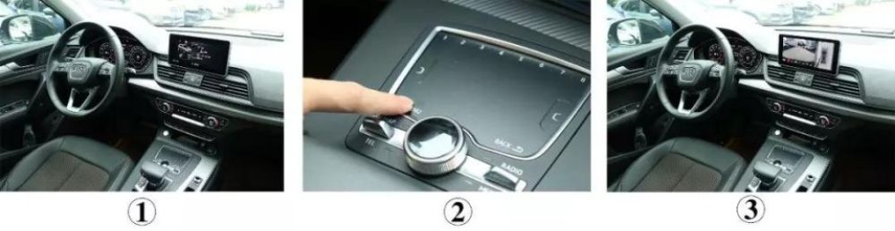 我们可以通过原车奥迪MMI触控板即可操作360°全景影像,抛弃以往遥控器的死板操作。那怎么进入全景界面呢?三种方法,一:长按触控板上的Menu键两秒进入全景界面;二:打左右转向灯(车速低于 25km/h),进入左右视对应的界面;三:挂倒车档进入后视界面;