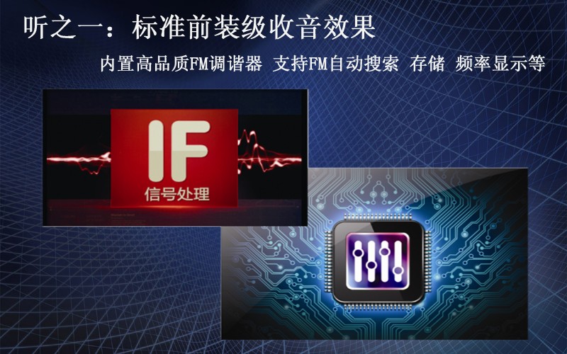 采用低中频调谐器高性能芯片,完全集成的调谐系统,具有低相位噪声和快速数字IF信号处理,超强抗干扰。内置高品质的FM调谐器,支持FM自动搜索、存储、频率显示、音色以及灵敏度调整。