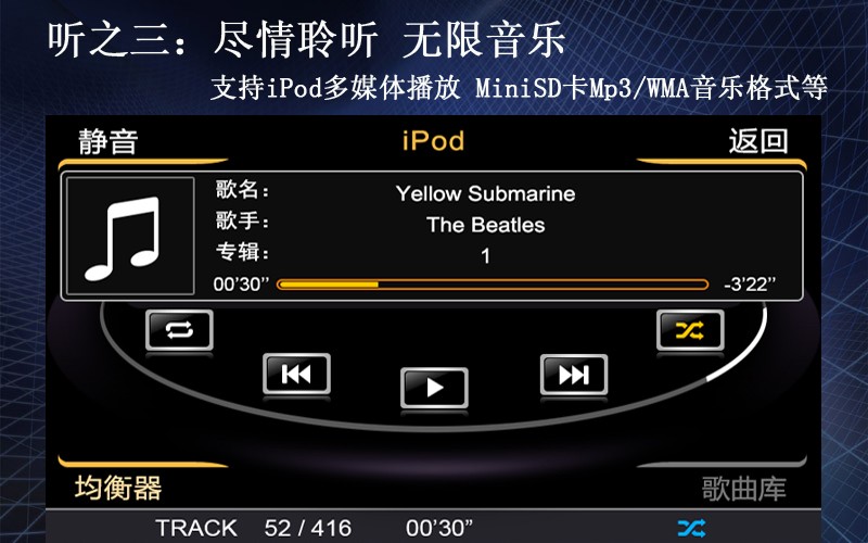 支持iPod、MiniSD卡等多媒体播放,尽情聆听无限音乐。