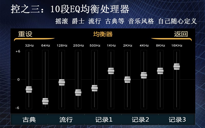 飞歌奥迪系列专用导航,拥有DSP数字音效处理技术,分解出中低高音,形成10段EQ均衡器,摇滚、爵士、流行、古典随心选择,音乐风格,自己定义。带来高保真、超越原车的多媒体音质效果。音乐风格,自由操控。
