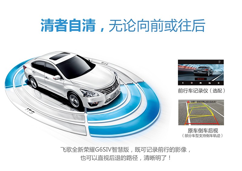 飞歌G6SⅣ智慧版可选配高清行车记录仪或高清数字摄像头,全面提升显示画质。这在行车记录仪方面体现尤为明显。前可记录行进的影像,再也不用担心“路上遇到个程咬金”,同时还能兼备短旅或长旅时风景摄像作用,后可直视后退路径,从此告别战战兢兢地倒车,简单明了。