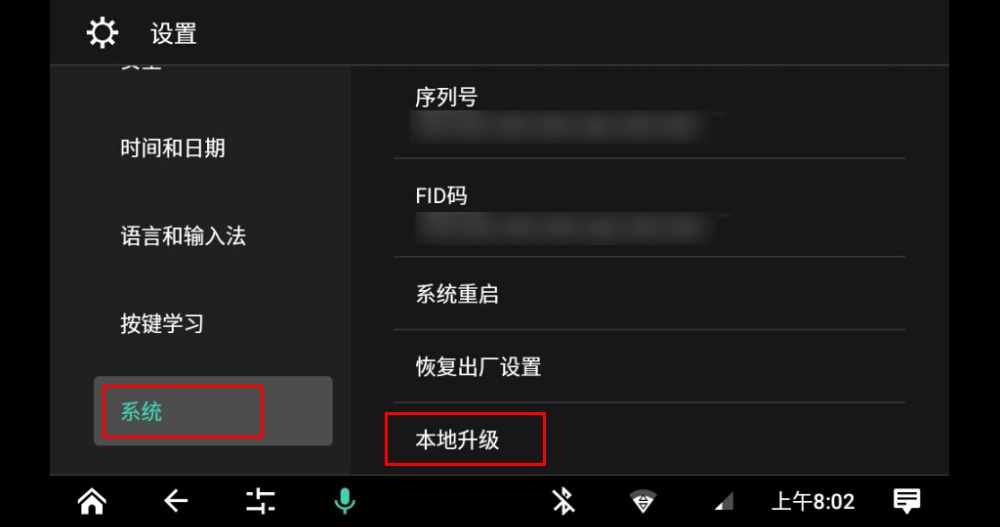 将U盘与GS2车机连接,点击车机“设置”-“系统”-“本地升级”。