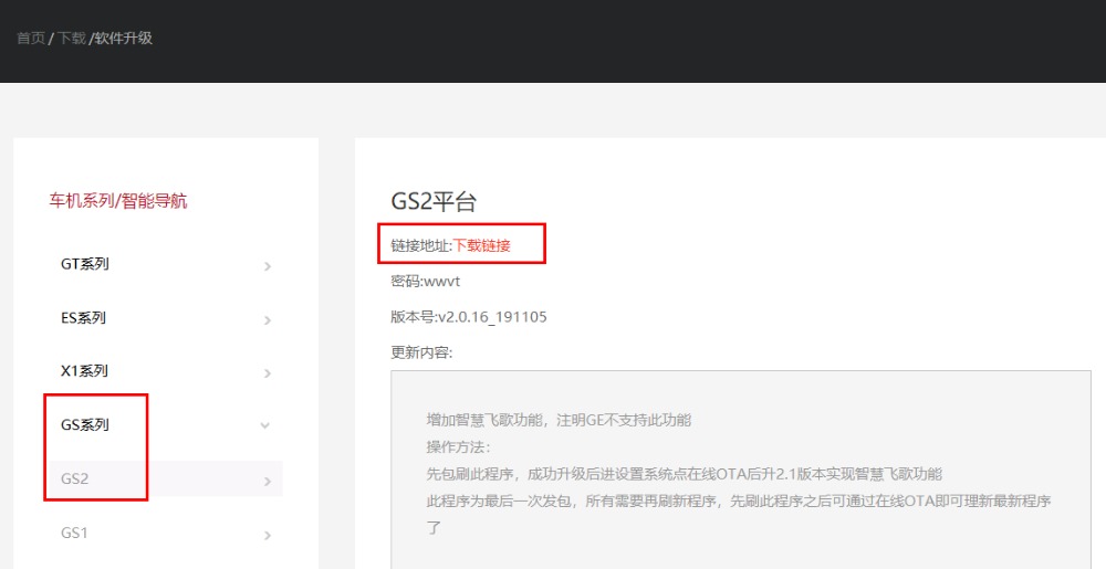 选择“GS系列”-GS2,点击右侧2.0升级包下载链接,输入提取码“wwvt”。