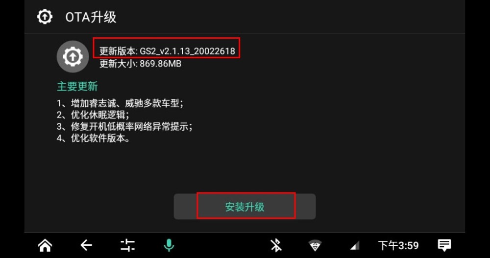 “安装升级”。升级期间车机会重启,切勿切断电源!